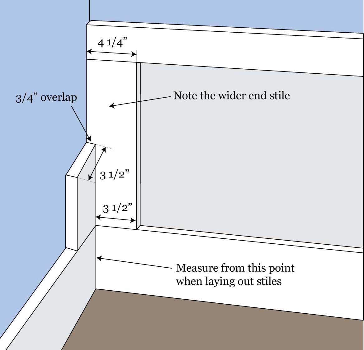 This can cause the stile on one edge to appear thinner than the rest since a portion of the stile is buried behind the wainscoting on the adjacent wall. To account for this, use a stile on each edge that is wider by the thickness of the stiles.